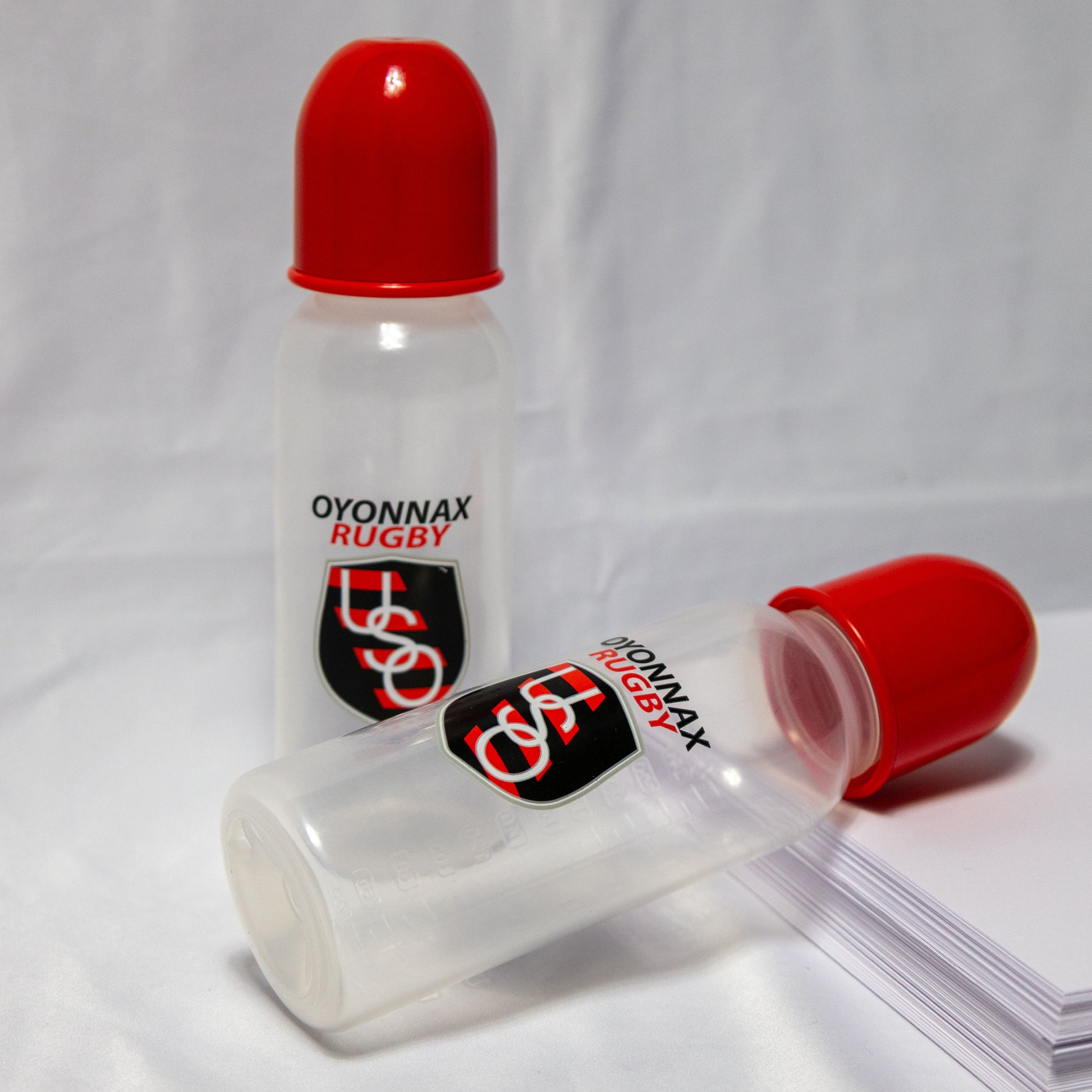 Biberon Oyonnax Rugby, idéal pour les nouveaux nés déjà supporters du club ! Vendu à l'unité.